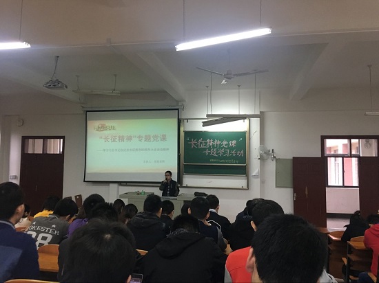 党员们集体学习了《红军长征的光辉历程和宝贵经验》以及《人民日报》评论员文章《再创历史的伟大远征——一论贯彻习近平总书记纪念红军长征胜利80周年讲话精神》、《弘扬伟大长征精神 ——二论贯彻习近平总书记纪念红军长征胜利80周年讲话精神》等。张辉老师从长征的历史回顾入手,向同学们阐释了长征精神的重要意义,使学生对长征精神有了更新的认识和理解。他鼓励学生在今后的学习与生活中应该秉承长征精神,不忘初心,无所畏惧,继续勇敢坚毅地前行。