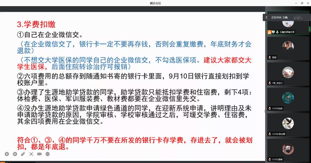 接着,王老师针对网上迎新系统展开了培训,借助学生的迎新系统界面逐次讲解了信息采集、健康状况、学习教育、入学教育、照片采集、到校登记、绿色通道、军训服装、财务缴费、报到单十个步骤,强调每一个步骤中的关键点。针对生源地助学贷款、绿色通道、学费缴纳等进行了详细的讲解。强调大家一定要养成习惯,关注QQ群消息,坚持每天健康打卡。