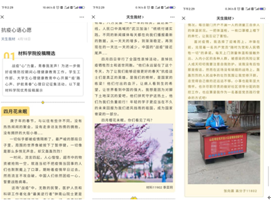 系列活动中,学院积极响应学工部、大学生心理健康教育中心号召,通过材料学院微信公众号“天生我材”开展“‘疫’路心声、护航青春”心理日记征集活动。大家通过心理日记,分享交流各自的战“疫”故事,探索对生命和人生的思考,寄托材料学子对祖国和人民的热爱,对父母家人的深情,和对自己全新的期许。