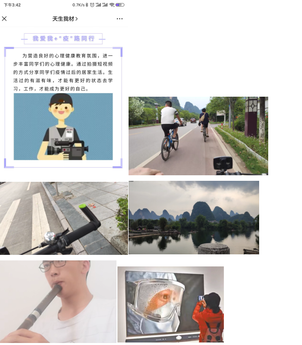参与“战疫”,不仅需要做好卫生防控,也需要做好心理防护,我院积极响应学校“我爱我+‘疫’路同行”短视频大赛号召,于学院内举办“共抗疫情,健康同行”短视频比赛,通过拍摄短视频的方式分享同学们疫情过后的居家生活。生活过的有滋有味,感受疫情中不同灵魂的体悟与成长,才能有更好的状态去学习,工作,才能成为更好的自己。