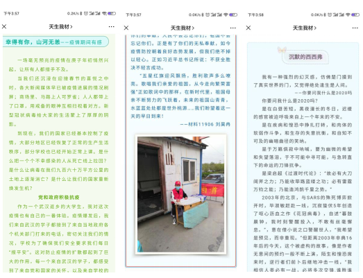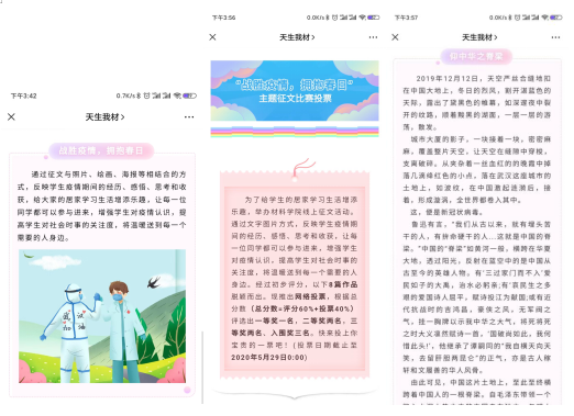 我院举办“战胜疫情,拥抱春日”主题征文活动,通过征文与照片、绘画、海报等相结合的方式,反映学生疫情期间的经历、感悟、思考和收获,给大家的居家学习生活增添乐趣,让每一位同学都可以参与进来,增强学生对疫情认识,提高学生对社会时事的关注度,将温暖送到每一个需要的人身边。