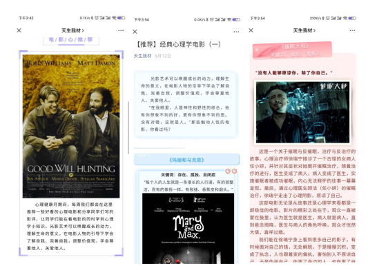 心理健康月期间,为丰富同学们的课余生活,以同学们喜闻乐见的方式传播心理健康知识,“心语心园”工作人员每周在材料学院微信公众号“天生我材”推荐心理电影,分享同学们撰写的影评,让同学们能在看电影的同时学到心理学小知识。