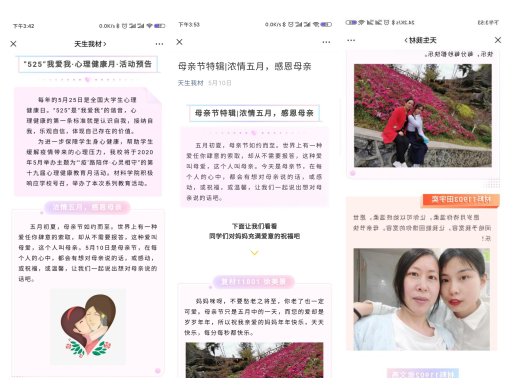 5月10日,为引导材料学子感恩母爱,回报母亲,我院借一年一度的母亲节举办“浓情五月,感恩母亲”主题活动活动,学生积极参加此次主题活动,以自己的方式向母亲表达最由衷的感谢和最诚挚的祝福。