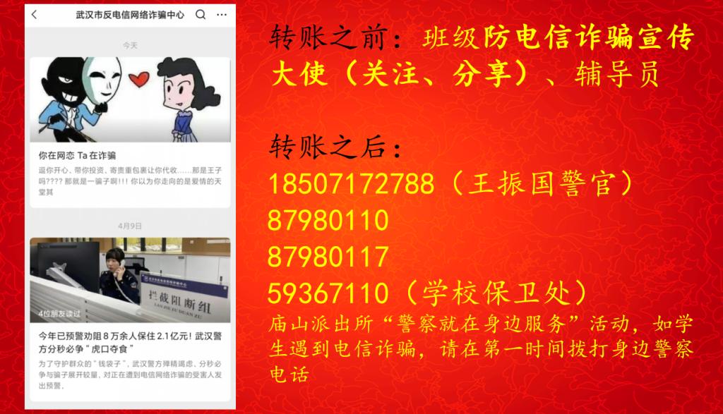 会上,毛老师还为同学们提供了日常生活中遇到转账问题时的解决方案:转账之前,找班级防电信诈骗宣传大使或辅导员甄别对方身份,谨防上当受骗;转账之后(受骗发生之后),第一时间联系庙山派出所王警官电话18507172788、庙山派出所电话87980110、87980117,及时止损;校园生活中遇到不良推销或其他安全事件,则第一时间联系学校保卫处电话59367110。竞赛活动的试题及答案也第一时间通过班委发到各班级群中,让所有同学都可以掌握正确答案,采取正确的处置方式。