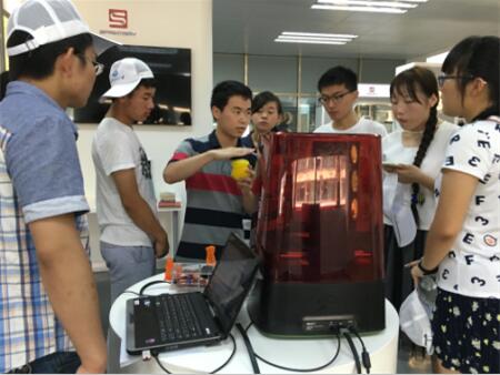 随后,饶磊带领队员们亲自动手,从Sprintray的软件操作、3D模型的创建乃至3D打印材料的选取和3D打印设备的操控,大家都学得非常认真。据介绍,今天现场打印所使用的材料正是我院包海峰教授自己研发的光敏树脂,是由预聚物、单体、光引发剂等成分组成的,光照之后引发聚合反应而由液体固化成固体,具有高强度、耐高温、防水的特点。在3D打印体验馆里,同学们对各种精美的3D打印成果赞叹不已,迫不及待地想要完成一件自己的3D打印作品。