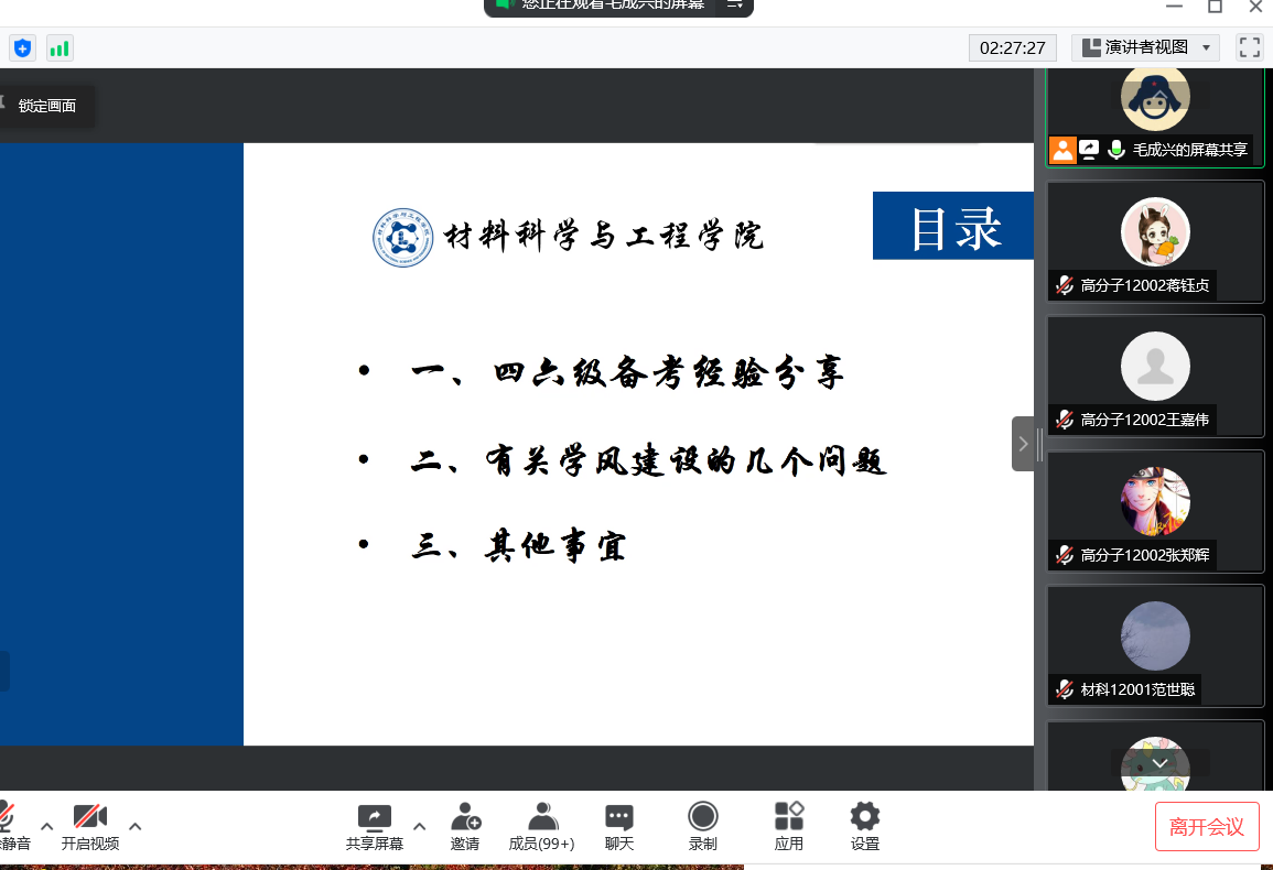 3月29日,材料学院召开了2020级学风建设大会。受疫情影响,会议采用在线会议的方式开展,2020级辅导员毛成兴及2020级全体同学参加了本次会议。