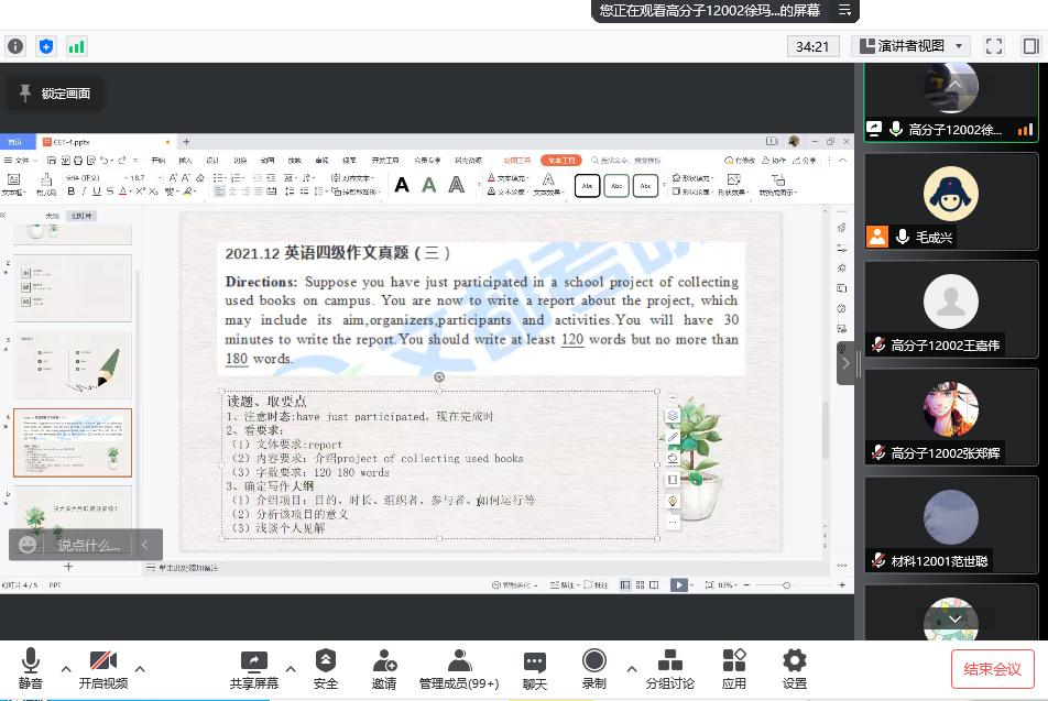 会上,各班在英语四级中取得优异成绩的6位同学做了四六级备考和应该技巧的经验分享。材科12001范世聪从听力、阅读、写作等各类题型的应试技巧方面做了详细讲解,高分子12001杨俊博强调了词汇量和真题训练的重要性,高分子12002徐玛莉分析经验的同时还以英语作文为例做了详细分解;复材12001余方韬则对四级考试进行“复盘”,针对英语基础不好的同学如何通过四六级考试分享了自己的观点,复材12002李慧娟重点分享了自己做阅读、选词填空等题目的心得体会。