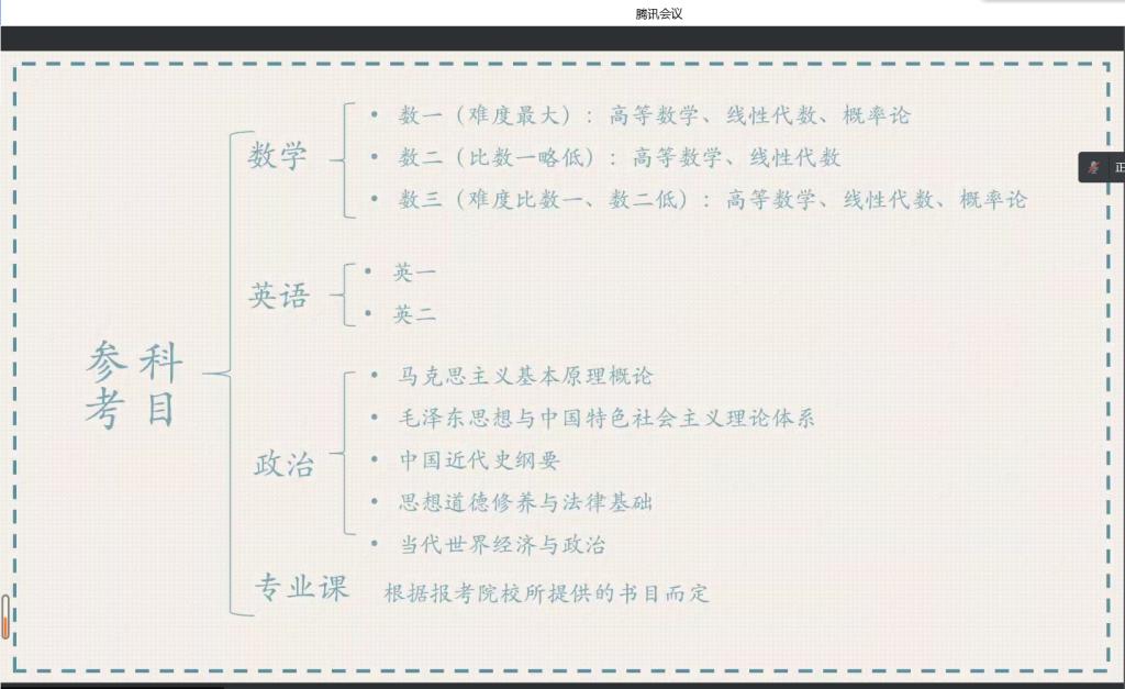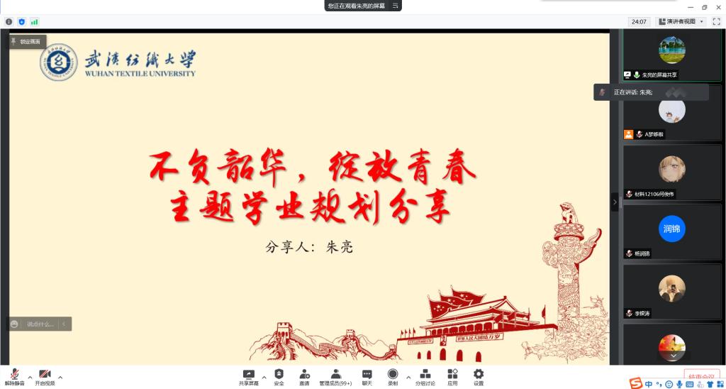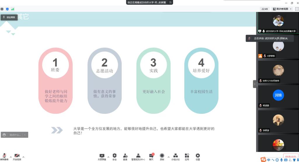 为进一步引导大一学生树立正确学业生涯规划,确立近、远期目标,选择适合自身发展的方向与目标,材料学院于4月17日晚在腾讯会议召开了2021级学业指导规划大会。邀请了2018级邓林冰、朱亮、李翠、张向晨作为主讲人分享大学四年的规划与收获,材料学院辅导员王鑫以及21级全体学生参加会议。