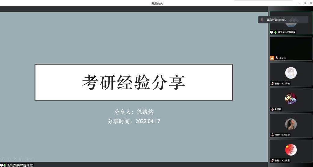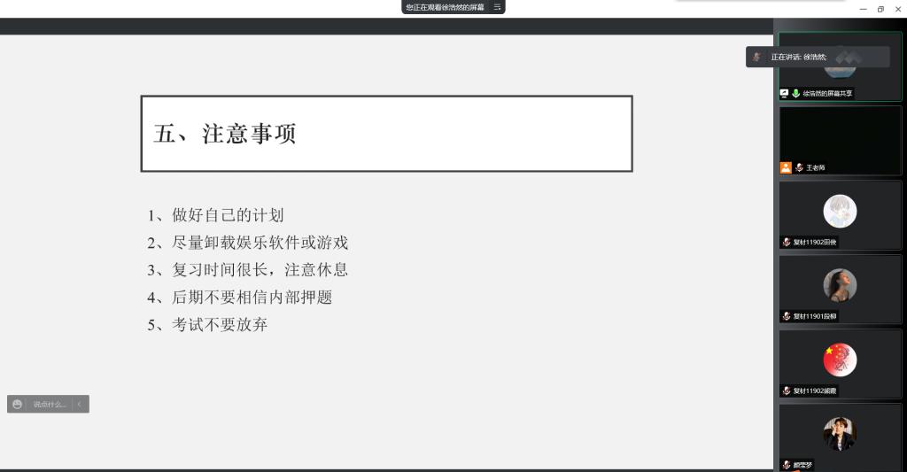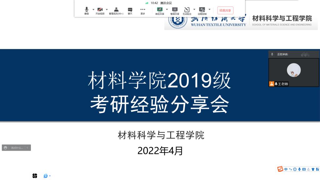 材料学院2018级考研录取率突破48%,为进一步做好2019级学生考研指导,4月17日下午,在腾讯会议举办了材料学院第二场考研经验分享会。邀请了2018级学生刘雅霜(376分考取武汉大学材料专业)、徐浩然(407分录取武汉理工大学材料专业)、颜梦莹(357分录取南京邮电大学材料专业)、余英杰(389分录取ok138cn太阳集团材料专业)主讲来分享考研经验,材料学院辅导员王鑫以及19级全体学生参加会议。