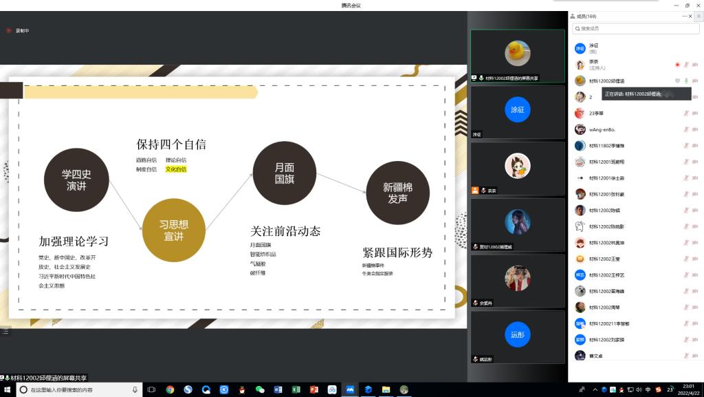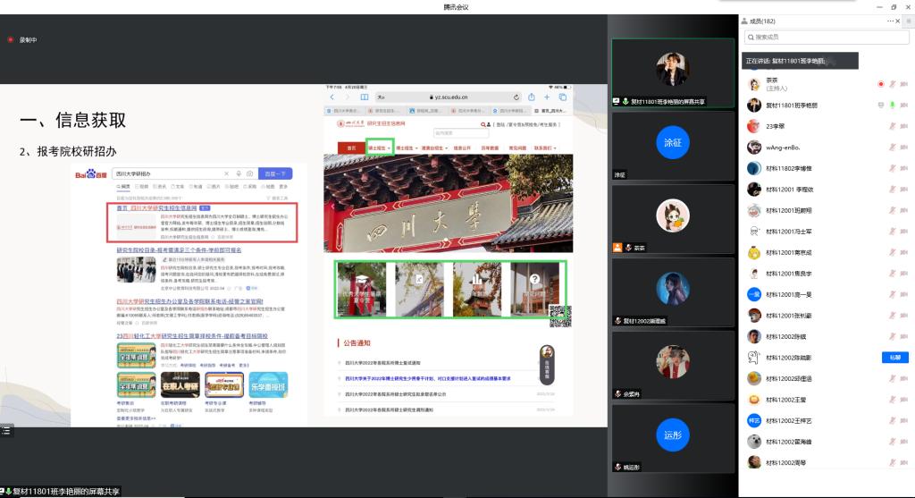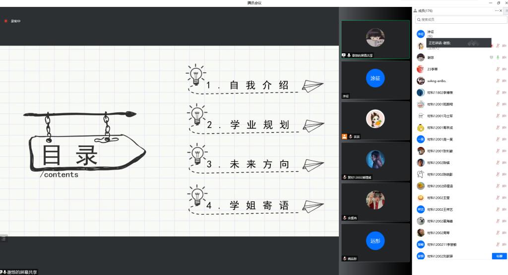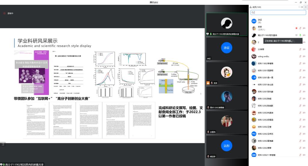 为更好地帮助学生规划好自己的学习生活,营造良好的学习氛围,4月22日晚,材料学院2020级学业规划分享会暨朋辈领航报告会在线上举行。本次会议邀请了毕业生代表姜鑫、李博惟、李艳丽、谢悠、朱亮、李翠,以及非毕业班代表、学校十大榜样人物候选人刘昊冉、邱俚涵等8名学生代表,分别分享了自己的学习和考研、科研和双创、社会实践和志愿服务等。学院辅导员老师毛成兴及全体2020级学生参加了本次会议。