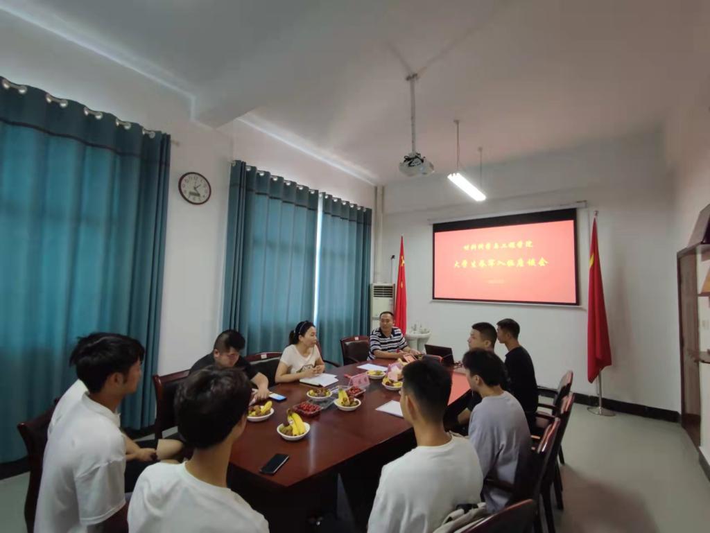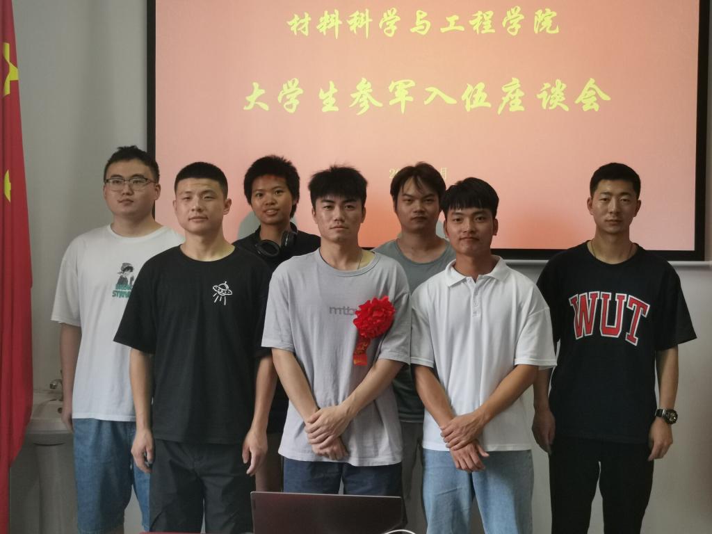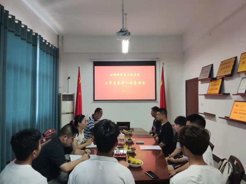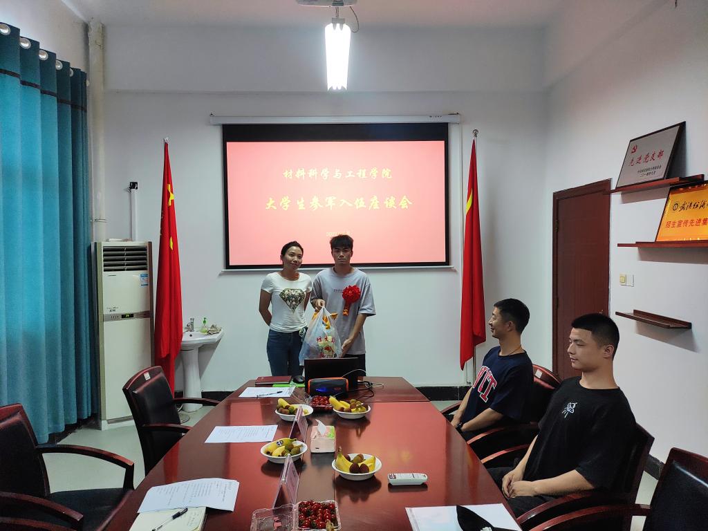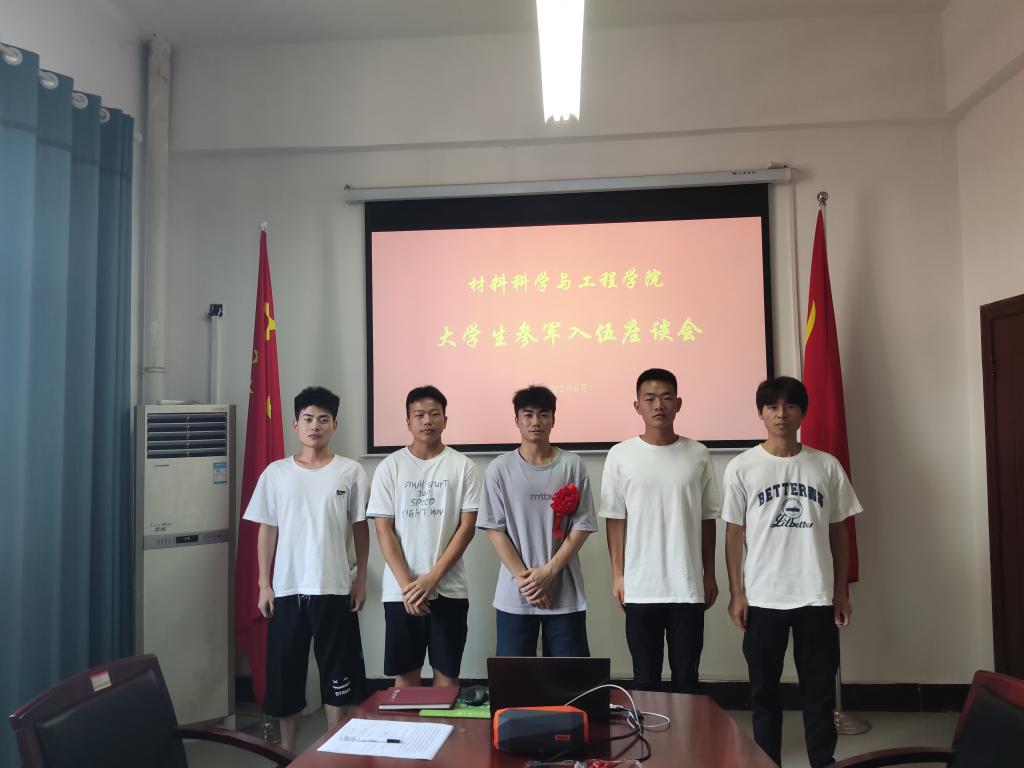 6月17日下午,材料学院召开大学生参军入伍座谈会暨2018级毕业生韦增翔“携笔从戎 参军报国”欢送会。学院党委副书记侯畅参加会议并发言,会议由学院征兵工作分站负责人、辅导员毛成兴主持,毕业年级辅导员胡晓、参军入伍毕业生韦增翔、退役大学生士兵代表、低年级意向参军学生近20人参加了本次会议。