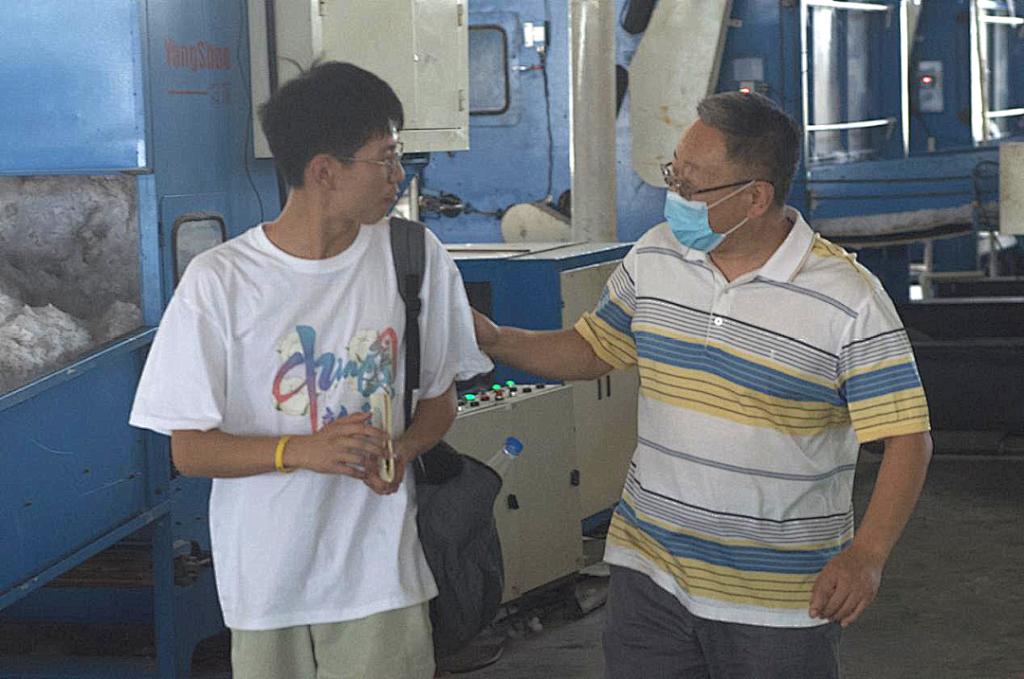最后,实践团队来到了精河县楚新农业发展有限公司,该公司响应中央和湖北省人民政府产业援疆、支持新疆纺织服装业发展而开办的一家援疆企业。在参观过程中,公司总经理马伟与团队殷教授交流了纺纱技术问题,并向实践团队成员讲解了目前纺纱行业得发展,以及对纺织技术型人才的需求,进一步加强了同学积极向上,励志援疆的决心。