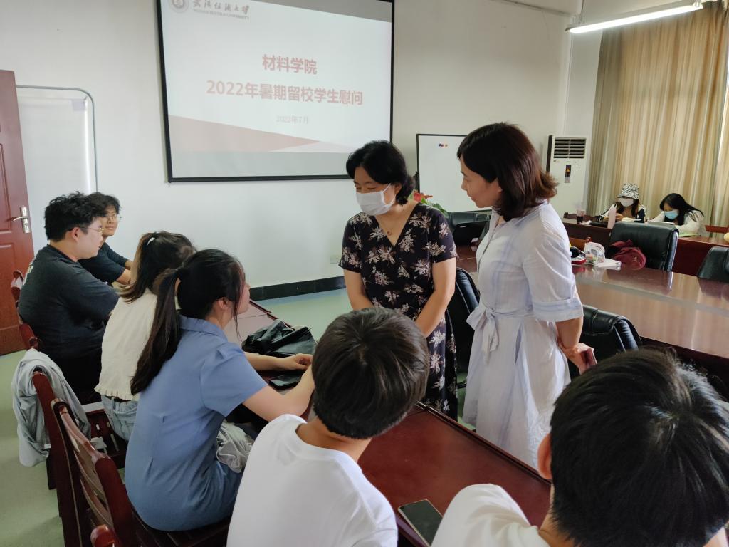 7月31日下午,材料学院党委书记陈桂枝,副书记侯畅,辅导员胡晓、毛成兴、曾玉竹到学院考研自习室看望暑期留校学生,并代表学院送上了慰问品和祝福。