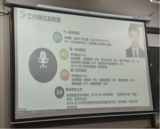 为积极响应学校“抓考研、促学风”的工作要求,营造优良的学习氛围,激发学生学习的主动性,材料学院于10月22日下午在03-120开展以“学业规划交流”为主题的朋辈领航分享会。考虑疫情影响,本次会议邀请2018级考研武汉理工大学的优秀学生代表李博惟做线上分享。辅导员毛老师以及2021级全体同学参加了本次大会。