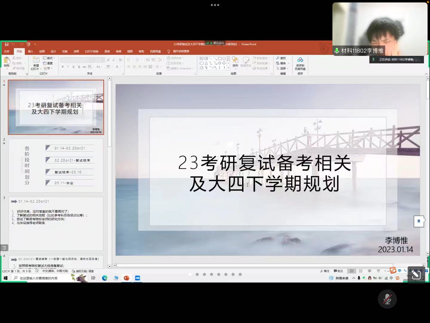 武汉理工大学研究生,材科11802班李博惟学长为19级考研学子做考研复试经验分享。他分别从23届考研复试备考及大四下学期规划做详细介绍,并以重点时间截点梳理了各阶段的重要事项。他以自己考研亲身经历为同学们解疑答惑,详细讲解了考研复试内容、导师联系技巧、调剂信息获取等内容,帮助同学们提升考研复试能力,提高上岸机率。