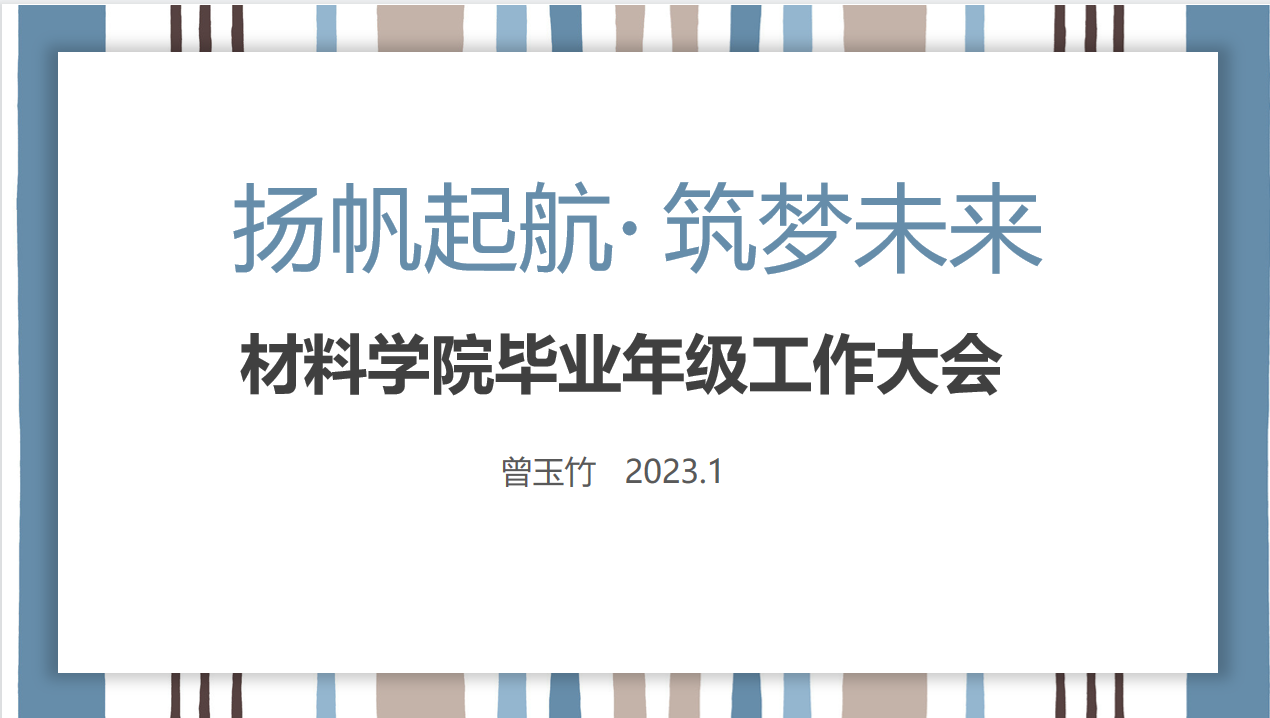 为进一步做好毕业生服务工作,帮助毕业生调整心态、做足准备,推动毕业工作各环节的顺利开展,1月14日,材料学院举办“扬帆起航、筑梦未来”毕业年级工作大会,会议由毕业班辅导员曾老师主持,全体19级学生参加会议。
