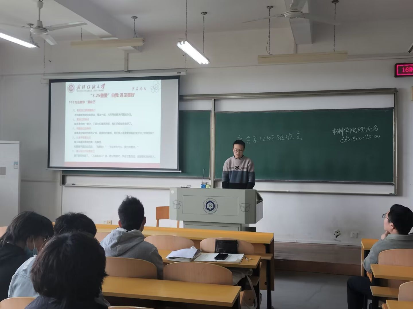 3月26日,材料学院在3号教学楼组织开展了“遇见自我 遇见美好”主题班会,重点学习了“3.25”如何善爱自我和防范诈骗知识。学院辅导员和班主任老师参加。