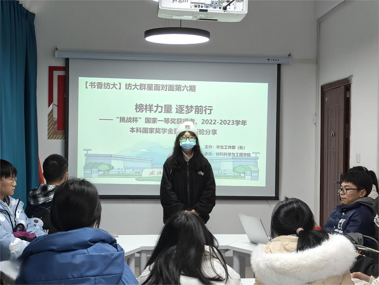 为充分发挥朋辈在学生学业、职业生涯规划中的引领作用,引导学院学生积极进取,传承优秀,12月12日下午,材料学院在“天生我材”学生成长服务站举办了第六期纺大群星面对面,“榜样力量 逐梦前行”--优秀学子经验分享活动。活动邀请了“挑战杯”国家一等奖获得者王佳琪、2022-2023学年本科国家奖学金获得者王梓龙、程翠主讲,材料学院全体辅导员及26名学生代表参加。活动由王鑫老师主持。