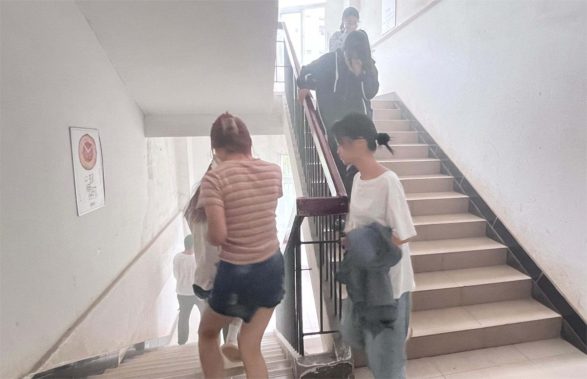 实战演习环节在“天生我材”学生成长驿站举办。同学们听到“火警”警铃后,迅速反应,低头弯腰,手捂口鼻、安静有序的按照预定疏散路线撤离出宿舍楼。刘诚老师结合学生们现场情况,进行总结和评价。
