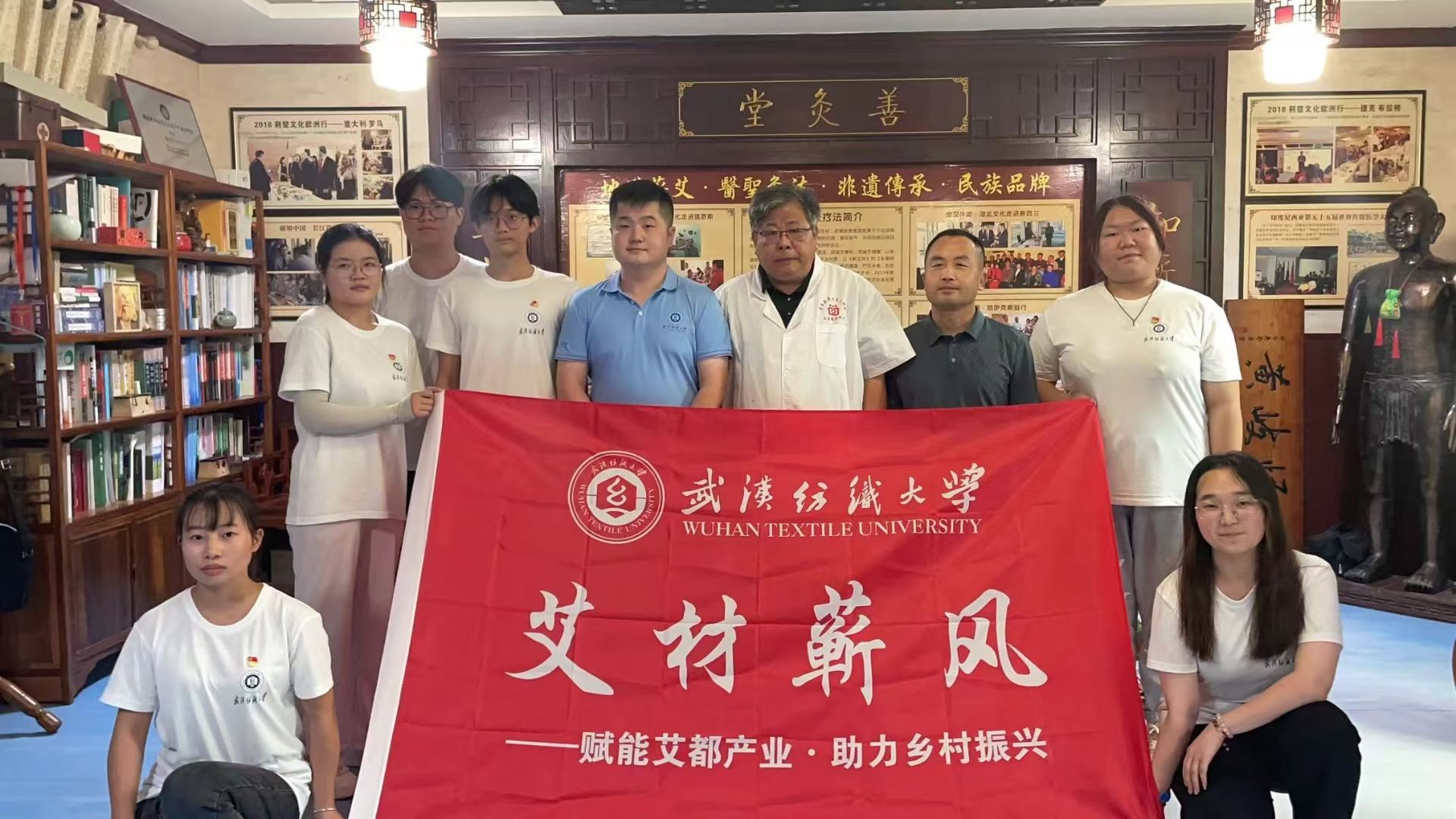 在参观蕲艾堂公司生产车间,实践团当即开展实习实训,从蕲艾繁育种植,到原料加工包装,再到产品营销推广等全产业链了解蕲艾。在蕲艾堂公司座谈会上,实践团还围绕艾草精油的提取及应用、艾草纤维在纺织品中的应用和目前的技术难点展开交流。实践团还参观了蕲艾产业发展示范园,多角度了解蕲艾产业和艾草纤维的应用,并聆听了蕲艾堂公司商学院艾灸师培训课,对艾灸技能和人体脉络有了新的认识,了解了艾灸养生的必要性和科学性,对蕲艾的神奇功效有了更深的认同。
