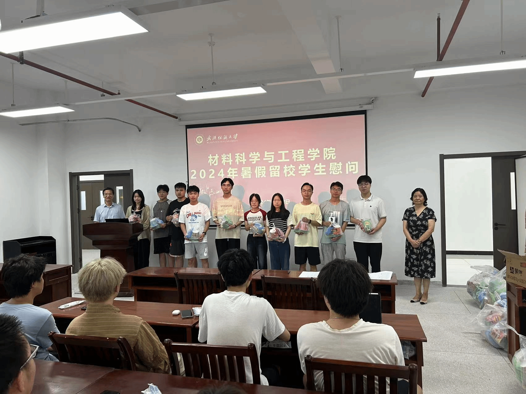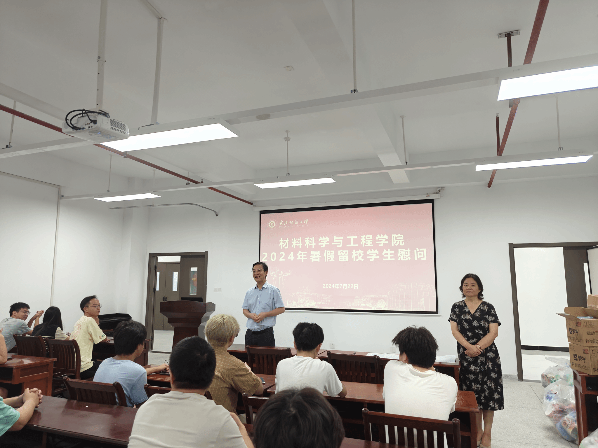 为深入了解学院暑期留校学生的思想、学习和生活状况,筑牢暑期留校学生的安全防线,材料学院于7月22日上午开展了暑期留校生慰问活动。院长王罗新、党委书记陈桂枝、值班辅导员参与此次慰问活动,活动由党委副书记魏剑主持。