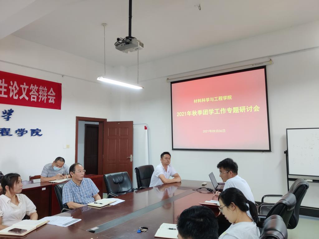 9月6日,材料学院召开2021年秋季团学工作专题研讨会,学院党委书记罗汉春,副书记侯畅,团委书记曾玉竹,各年级辅导员、专任老师代表参与会议,会议由曾玉竹主持。