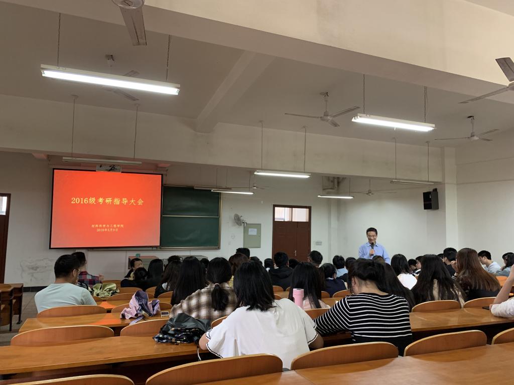 5月9日下午两点,材料学院在8F-t101举办了考研指导动员大会,特邀材料学院院长王罗新教授作为主讲人。2016级全体考研同学参加了此次大会。
